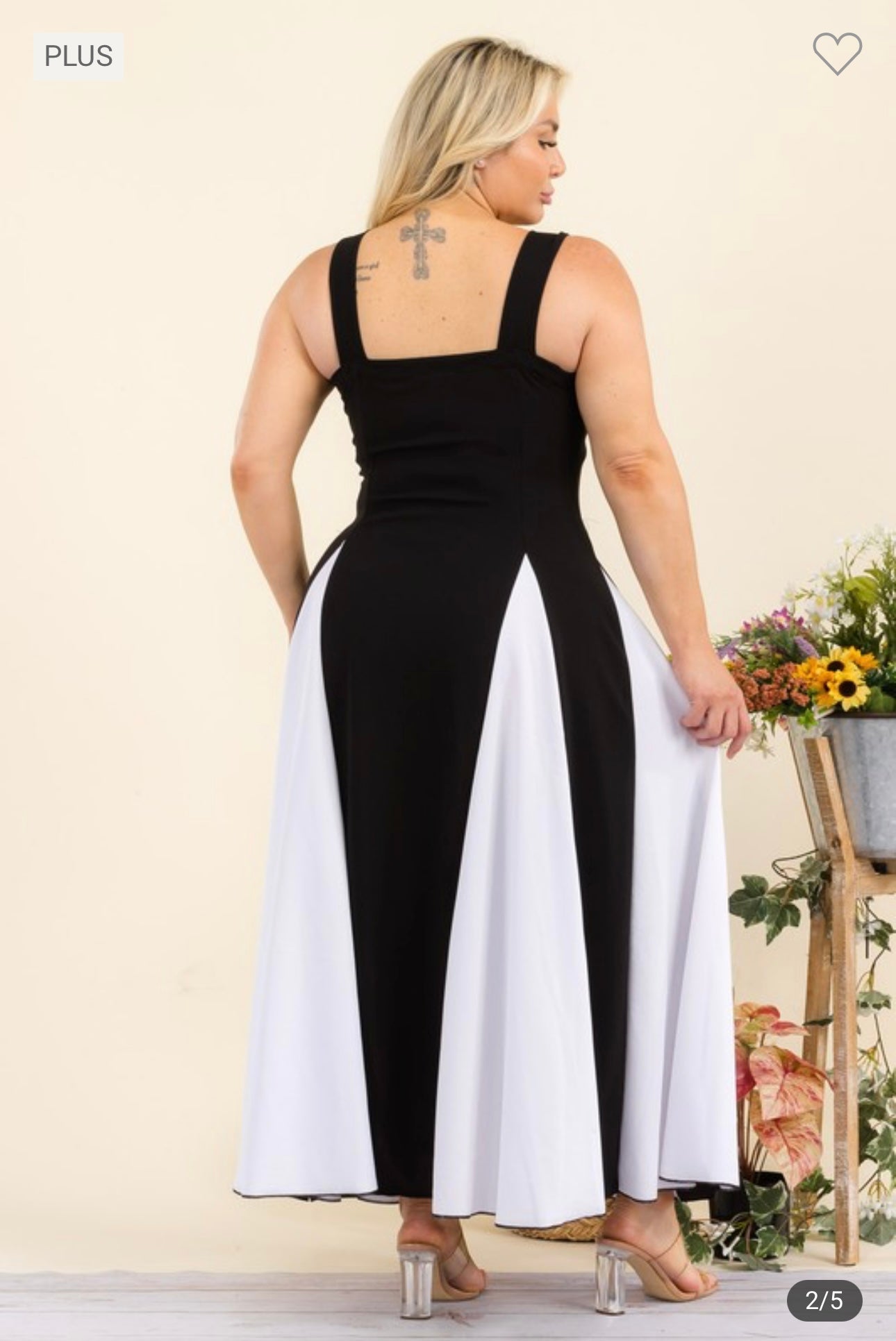 Take a fashion risk with the Joan - Black White Dress. This sleeveless color block maxi dress features pleats and a comfortable, stretchy fabric. Show off your bold style and make a statement with this unique dress!